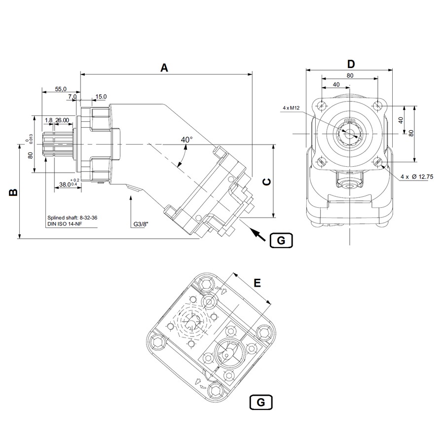 Model: 2PBA 108 (Standard Version) Structure: Inclined axis fixed displacement piston pump Theoretical Displacement: 108.4 cc/rev Rated Working Pressure: 350 bar (35 MPa) Peak Pressure (Intermittent): 400 bar (40 MPa) Max. Continuous Speed: 1700 rpm Max. Limiting Speed: 1900 rpm Min. Speed: 500 rpm Drive Torque: 620 Nm @ 350 bar Volumetric Efficiency: ≥ 97.5% Weight: 15.5 kg